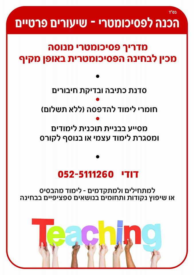 תחומי לימוד והתמחויות: פסיכומטרי - פסיכומטרי מילולי, פסיכומטרי כמותי, פסיכומטרי פרק אנגלית, פסיכומטרי חיבור