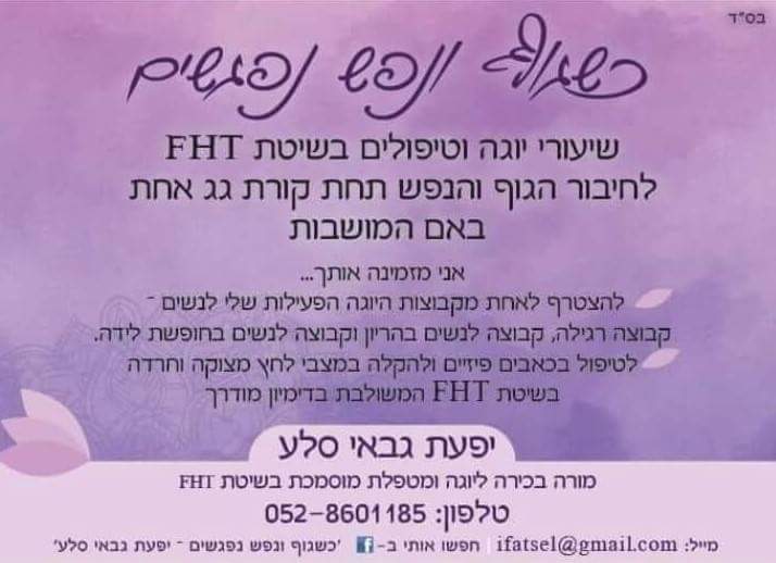 שלום לכולם, הנני מורה ליוגה משנת 2013 למדתי במכללת ווינגייט נתניה לימודים במשך 3 שנים אני מלמדת בקבוצות וביחידים נשים ונשים בהריון. בנוסף אני מטפלת בשיטת FHT טיפול שעובד על דימיון מודרך ומגע אנרגטי בבעיות פיזיות וריגשיות. אשמח לתת פרטים נוספים 0528601185
