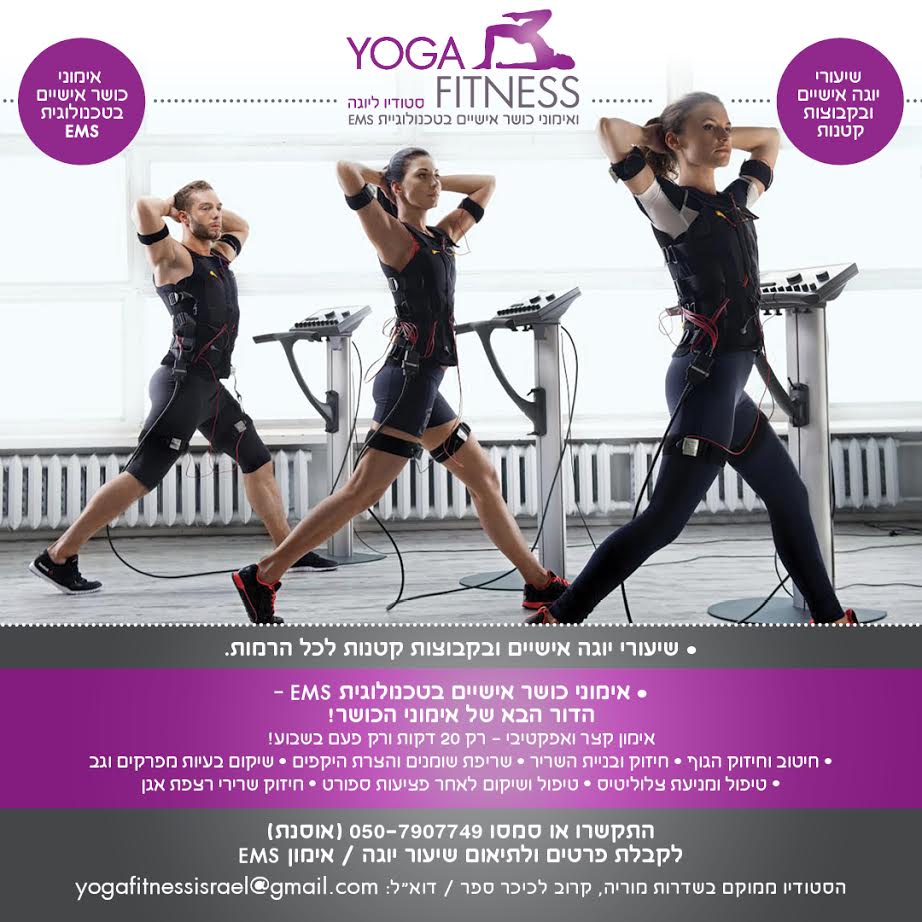 סטודיו בוטיק ליוגה ואימוני כושר אישיים בטכנולוגית EMS • חיטוב וחיזוק הגוף • חיזוק ובניית השריר • שריפת שומנים והצרת היקפים • שיקום בעיות מפרקים וגב • טיפול ומניעת צלוליטיס • טיפול ושיקום לאחר פציעות ספורט • חיזוק שרירי רצפת אגן אימון פרטי בהתאמה אישית ובליווי צמוד ! כולם יודעים שאימון גופני הוא אחד הרכיבים הבסיסים במתכון לאורך חיים בריא, לחיזוק הגוף ולתחושה טובה גופנית ונפשית. ביוגה פיטנס לא רק יודעים אלא גם עושים. האימון האישי מתבצע בהתאמה אישית לכל אחד ואחת על פי מצב בריאותי, מטרות, לוח זמנים שמתאים, יכולות אישיות ומעקב אחר ההתקדמות. ביוגה פיטנס קיימים 2 סוגי אימון עיקריים: אימון EMS קצר - 20 דקות בלבד, בתדירות של פעם-פעמיים בשבוע בלבד עושה פלאים לגוף ולנפש. האימון קצר, מהנה והתוצאות מהירות! שיעור יוגה פרטי המותאם באופן אישי מומלץ תמיד ובכל יום לכל אחד ובכל מצב גופני או בריאותי. שילוב בין השניים מומלץ בחום.
